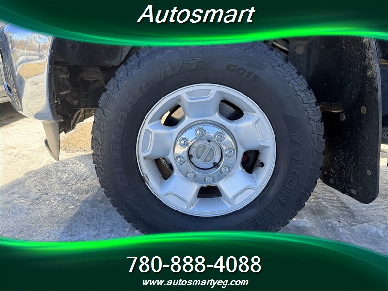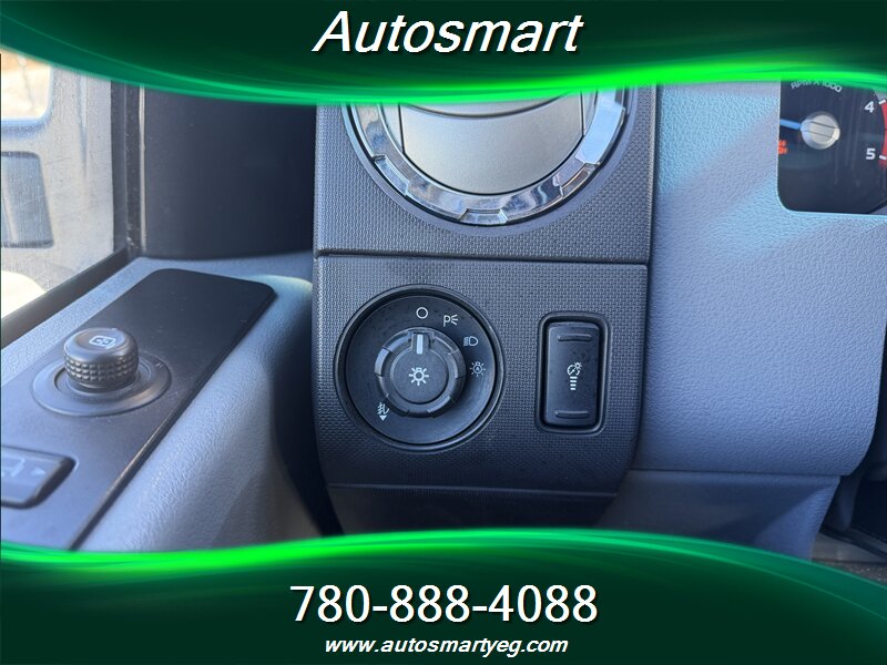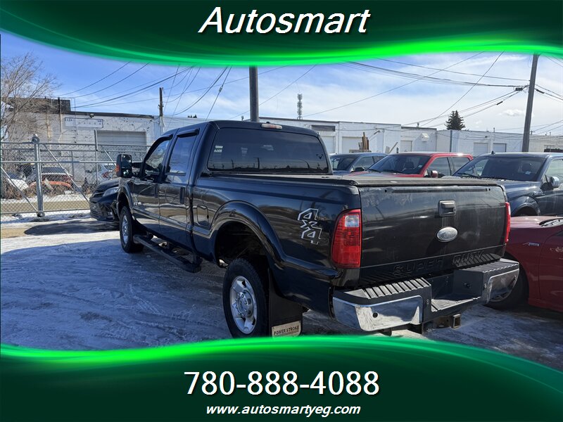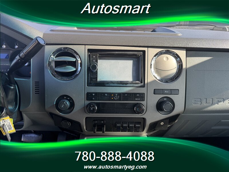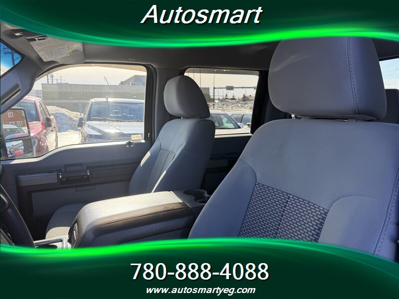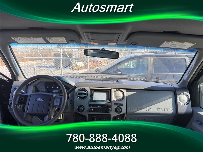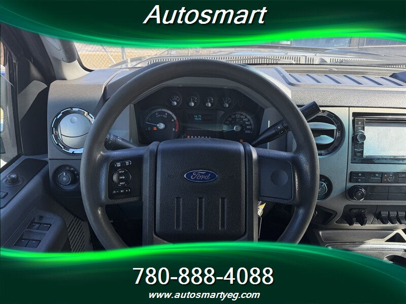2011 Ford F-350 Super Duty XLT powered by the 6.7L Power Stroke biodiesel-capable turbo V8 (400 hp, 800 lb-ft). Factory-standard XLT equipment includes chrome exterior trim, heavy-duty Super Duty frame and suspension, tow-ready features for commercial use, and heated power towing mirrors. Interior features include cloth seating with center console, air conditioning, cruise control, tilt steering, power windows and door locks, remote keyless entry and an AM/FM/CD stereo with auxiliary input and steering-wheel controls. Safety and chassis systems are factory-installed: ABS, traction/stability control, multiple airbags and heavy-duty braking; the truck has under 154,000 km (averaging <10,000 km/yr), is in excellent overall condition and shows a CARFAX.