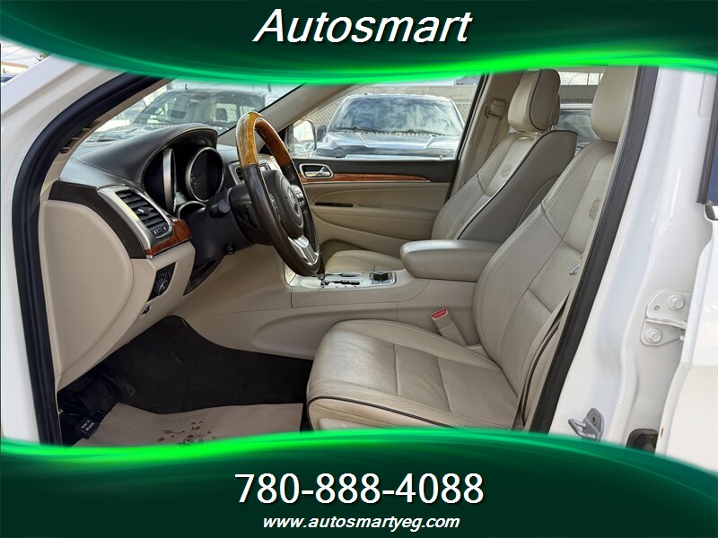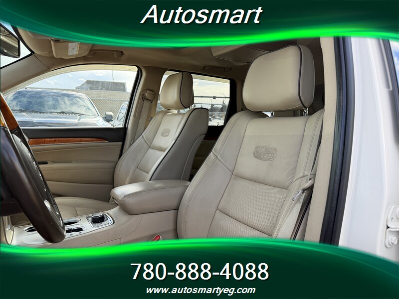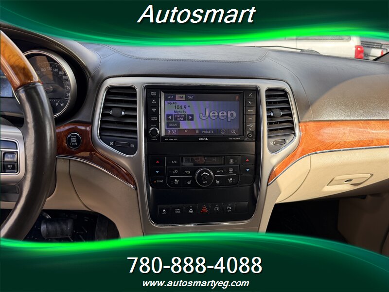 2011 Jeep Grand Cherokee Overland powered by the HEMI 5.7L V8 (360 hp, 390 ft-lb) with factory-rated fuel consumption of 18.1 L/100 km city and 12.4 L/100 km highway. Factory-equipped with premium leather seating, heated and ventilated front seats, power-adjustable driver with memory, dual-zone automatic climate control, power sunroof, factory navigation and Uconnect infotainment with Bluetooth and steering-wheel controls, backup camera, remote keyless entry, premium alloy wheels, xenon headlights and fog lamps, and a full suite of safety systems including traction and stability control and multiple airbags. Vehicle is in excellent overall condition and has a CARFAX.
