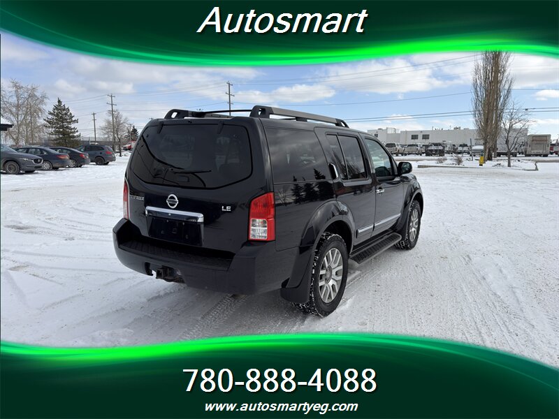 2011 Nissan Pathfinder S powered by a 4.0L V6 producing 266 hp and 288 lb-ft of torque, paired with a 5-speed automatic transmission. Factory-standard equipment includes three-row seating for up to seven with cloth upholstery, air conditioning, cruise control, power windows/locks/mirrors, remote keyless entry, and an AM/FM/CD audio system with auxiliary input and six speakers. Safety features include anti-lock brakes (ABS), electronic stability and traction control, front-seat side-impact and full-length curtain airbags, and a tire pressure monitoring system. Fuel consumption is 16.8 L/100 km city and 11.8 L/100 km highway; the vehicle is in excellent overall condition and has a CARFAX.