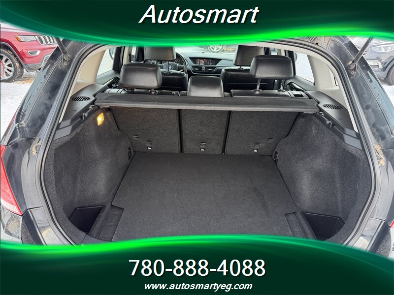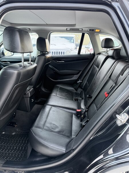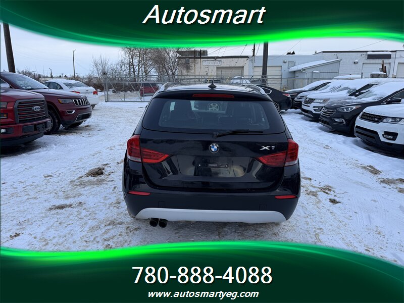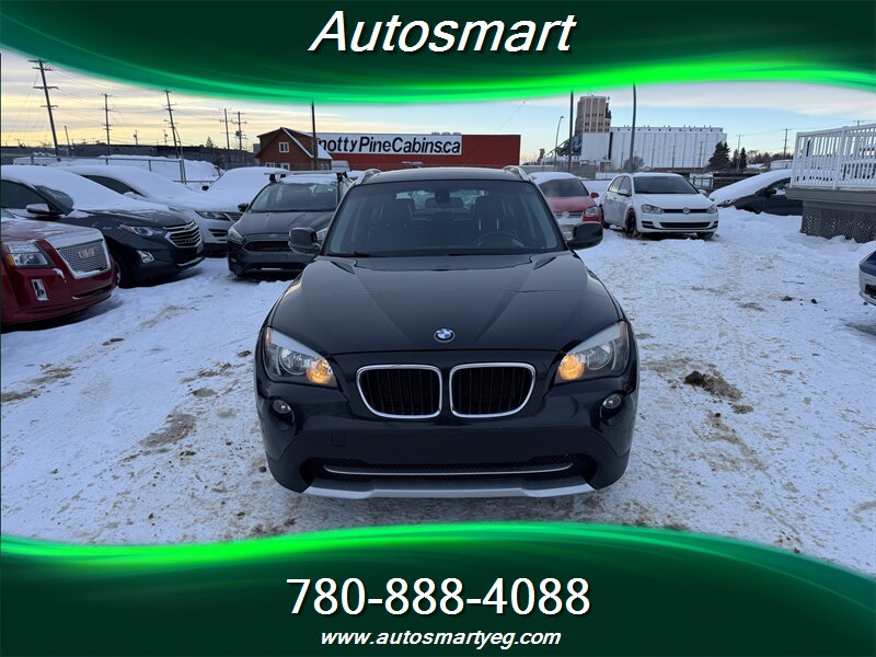 2012 BMW X1 xDrive28i — Black exterior, Black interior. Factory-standard equipment includes BMW xDrive all-wheel drive, Steptronic automatic transmission with manual-shift capability, power windows/locks/mirrors, remote keyless entry and cruise control, dual-zone automatic climate control, AM/FM/CD audio with auxiliary/USB input and Bluetooth hands-free connectivity, iDrive controller with center display, steering-wheel audio and phone controls, alloy wheels and roof rails, split-folding rear seats and adjustable cargo floor for added utility. Standard safety features include ABS, traction and stability control, front and side airbags with curtain protection and a tire pressure monitoring system. This vehicle has excellent overall condition, a CARFAX report, and under 98,000 km of use (averaging less than 7,000 km per year)