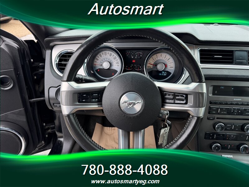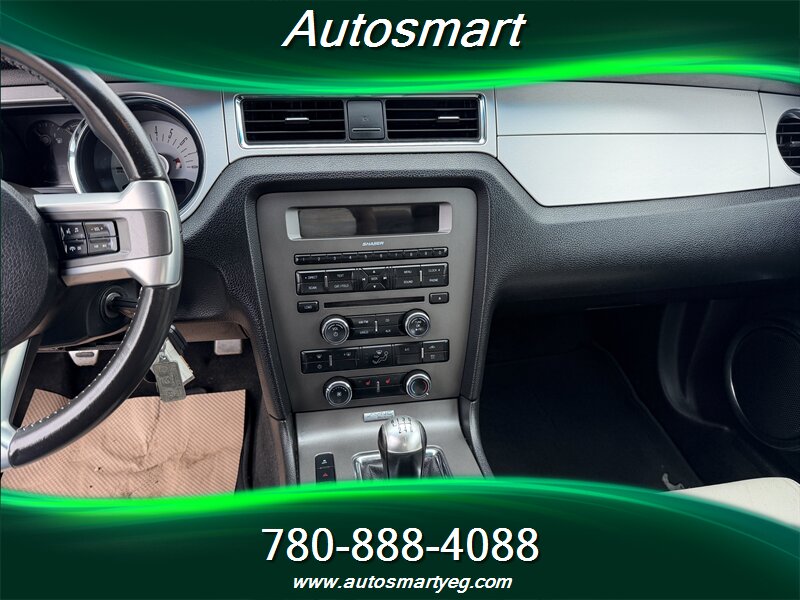2012 Ford Mustang V6 with the 3.7L V6 engine (305 hp, 280 lb-ft). Factory equipment includes cloth sport seats, air conditioning, cruise control, tilt steering, power windows/locks/mirrors and remote keyless entry, AM/FM/CD audio with auxiliary input, trip computer, 17-inch alloy wheels, anti-lock brakes with traction and stability control, front and side airbags and a tire-pressure monitoring system. Good mileage with under 139,000 km (averaging <10,000 km/year), rated 12.4 L/100 km city and 8.1 L/100 km highway. Vehicle is in excellent overall condition with a CARFAX.