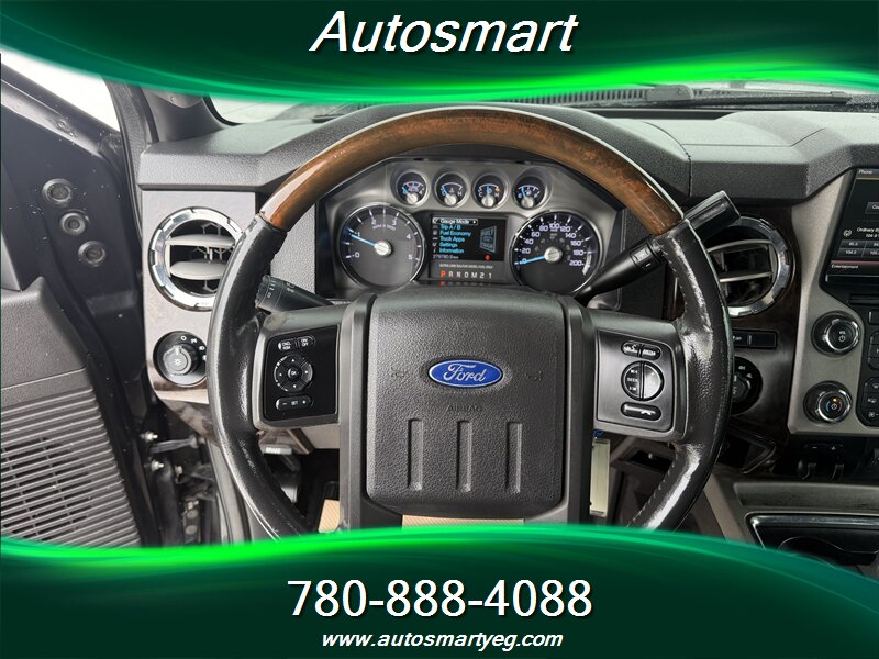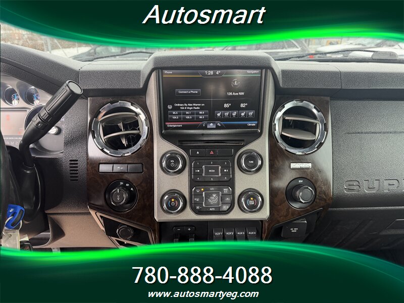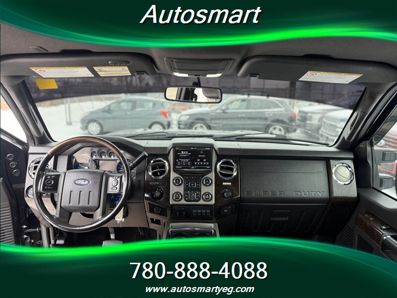 2013 Ford F-350 Super Duty Platinum, powered by the 6.7L Power Stroke biodiesel-capable turbo V8 (400 hp, ~800 lb-ft) mated to Ford’s TorqShift 6-speed automatic transmission. The Platinum trim includes factory luxury and convenience features such as leather-trimmed seating with heated and ventilated front seats and power-adjustable driver memory, dual-zone automatic climate control, premium audio with Bluetooth and steering-wheel controls, factory navigation and rearview camera, power-sliding rear window, power-folding heated mirrors, chromed exterior trim with polished alloy wheels and power-deployable running boards, and a factory tow package with integrated trailer brake control and stability/trailer sway systems. Standard safety and chassis equipment include ABS, traction and stability control, multiple airbags, and heavy-duty suspension components. Vehicle is in excellent overall condition and has a CARFAX.