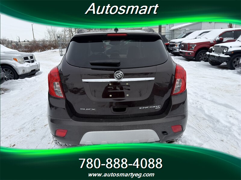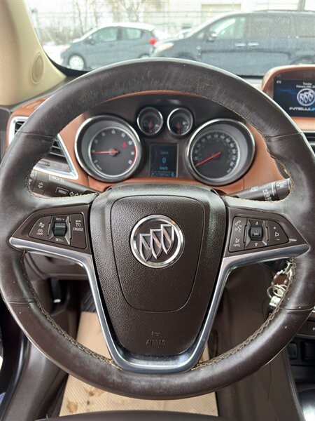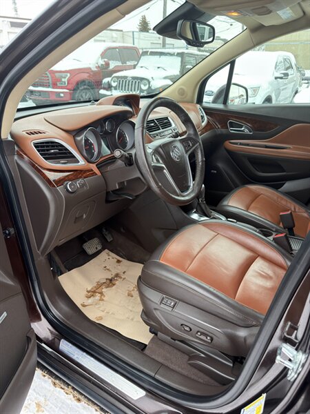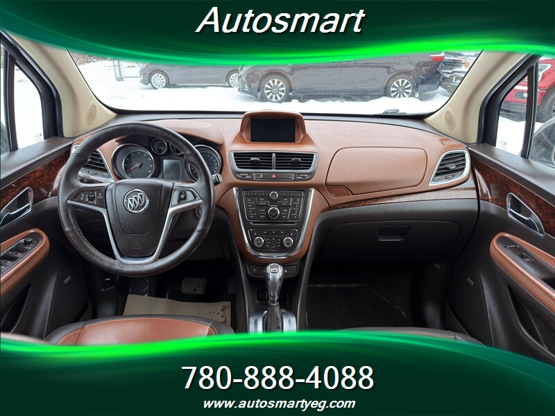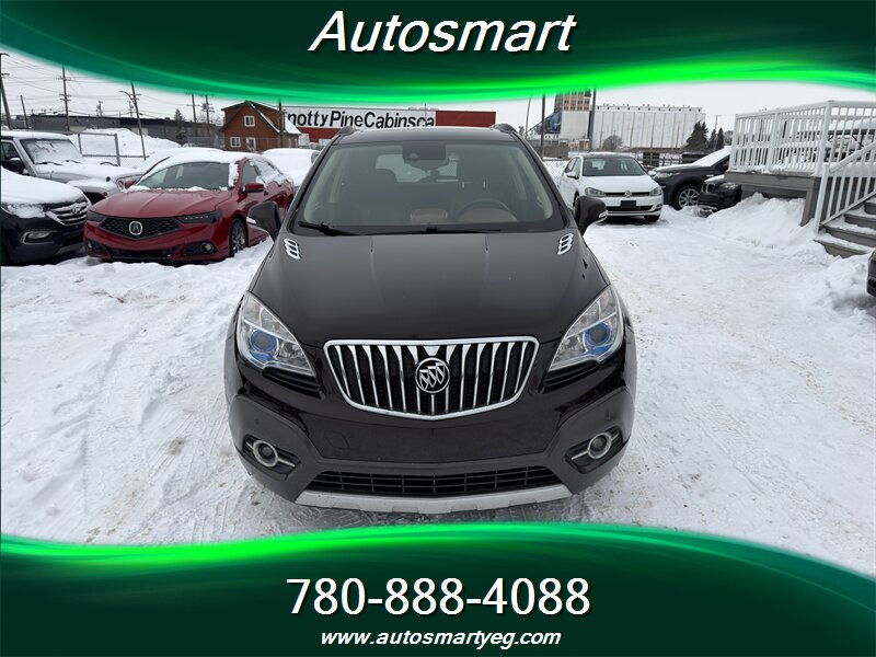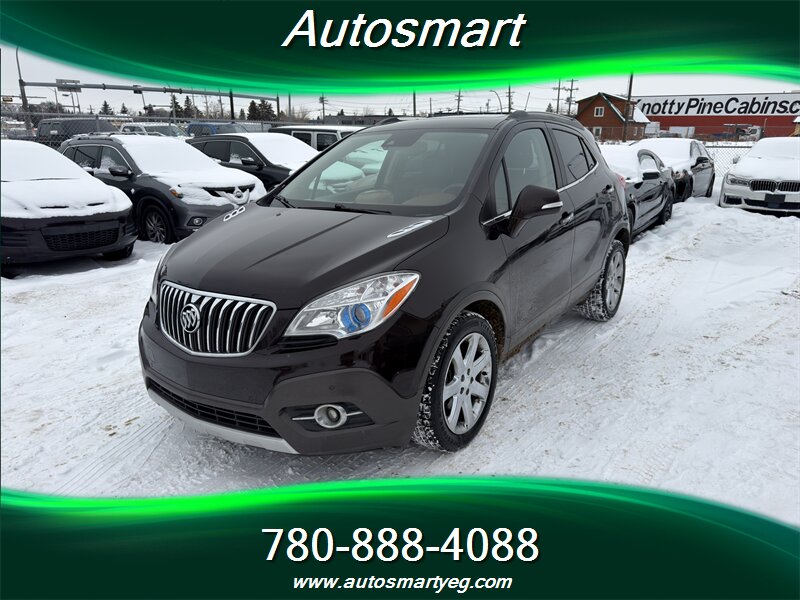 2014 Buick Encore Premium — Ecotec 1.4L Turbo I4 (138 hp, 148 lb-ft), automatic transmission. Well maintained with under 112,000 km (averaging <9,000 km/year), excellent overall condition and a CARFAX. Fuel economy: 10.2 L/100 km city, 7.8 L/100 km highway. Factory equipment on the Premium trim includes leather-appointed seating with heated front seats and power driver’s seat, Buick IntelliLink infotainment with Bluetooth and USB input, AM/FM audio, steering-wheel audio and cruise controls, alloy wheels, fog lamps, power windows/locks/mirrors, keyless entry, ABS with traction and stability control, multiple airbags and OnStar connectivity.