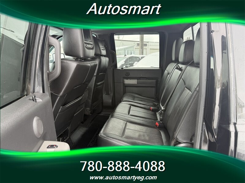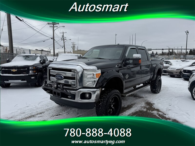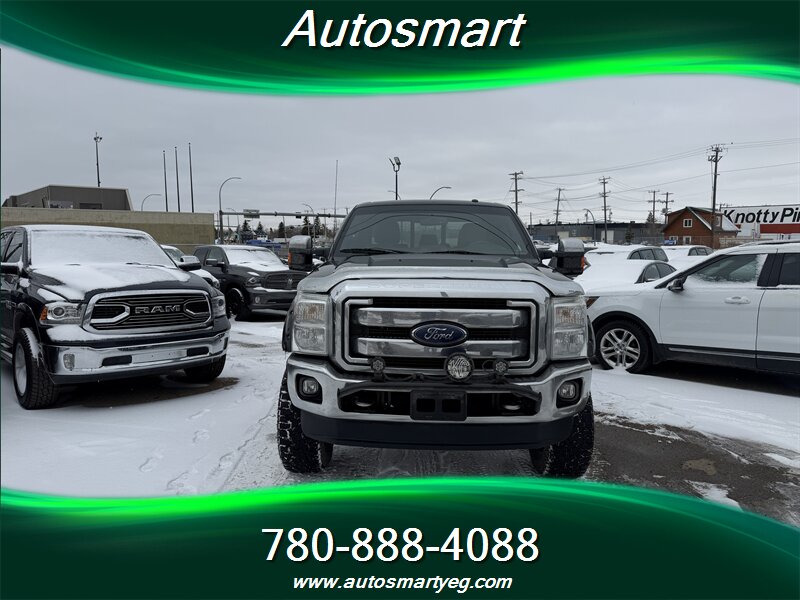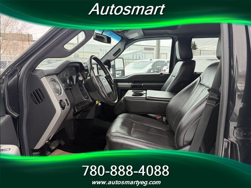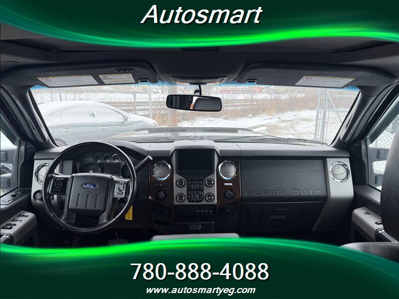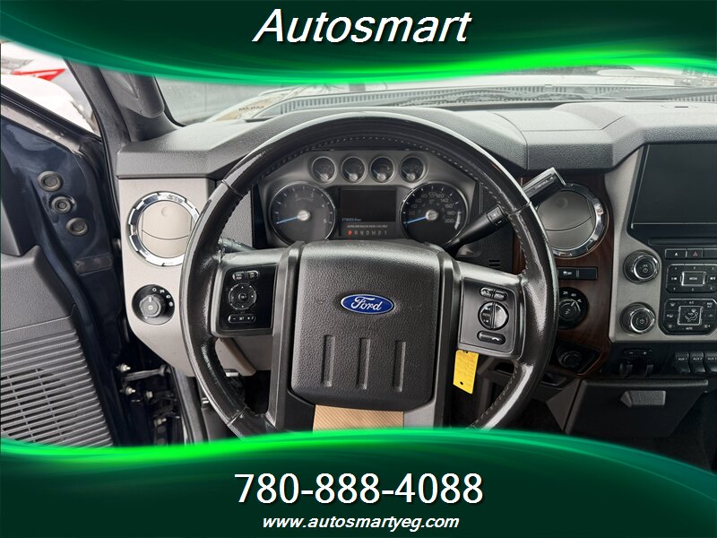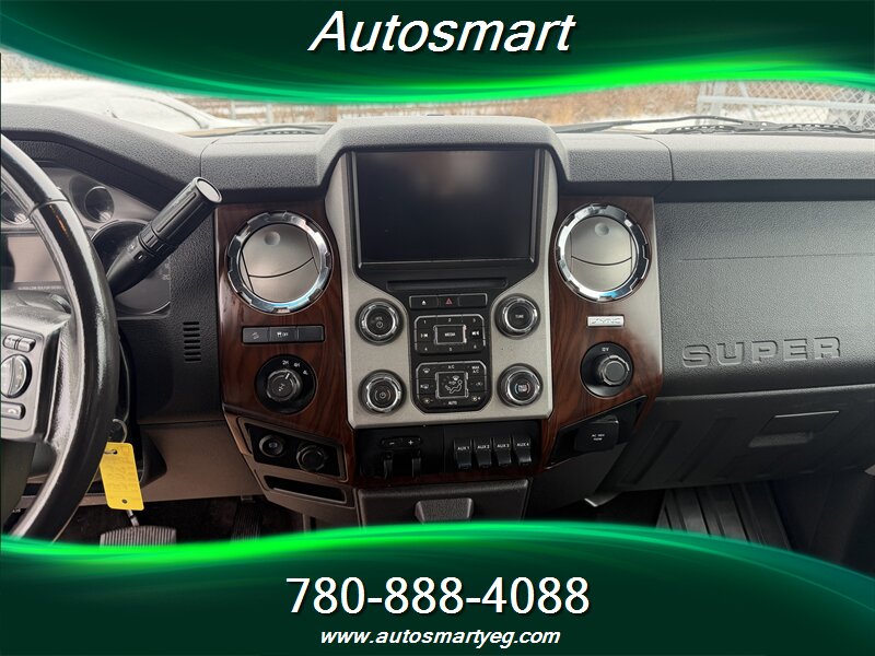 2015 Ford F-350 Super Duty Lariat powered by the 6.7L Power Stroke biodiesel-capable turbo V8 (440 hp, 860 lb-ft) with TorqShift six-speed automatic. Factory Lariat equipment includes leather-trimmed heated and power-adjustable front seats, dual-zone automatic climate control, Ford SYNC with Bluetooth and steering-wheel audio controls, power windows/locks and remote keyless entry, tilt/telescoping steering wheel, and cruise control. Built for towing with heavy-duty suspension, factory towing prep including integrated wiring and trailer brake control, heated power towing mirrors and chrome exterior trim with running boards. Safety features include four-wheel ABS, stability and traction control, front and side-curtain airbags and tire-pressure monitoring. Excellent overall condition with a CARFAX.