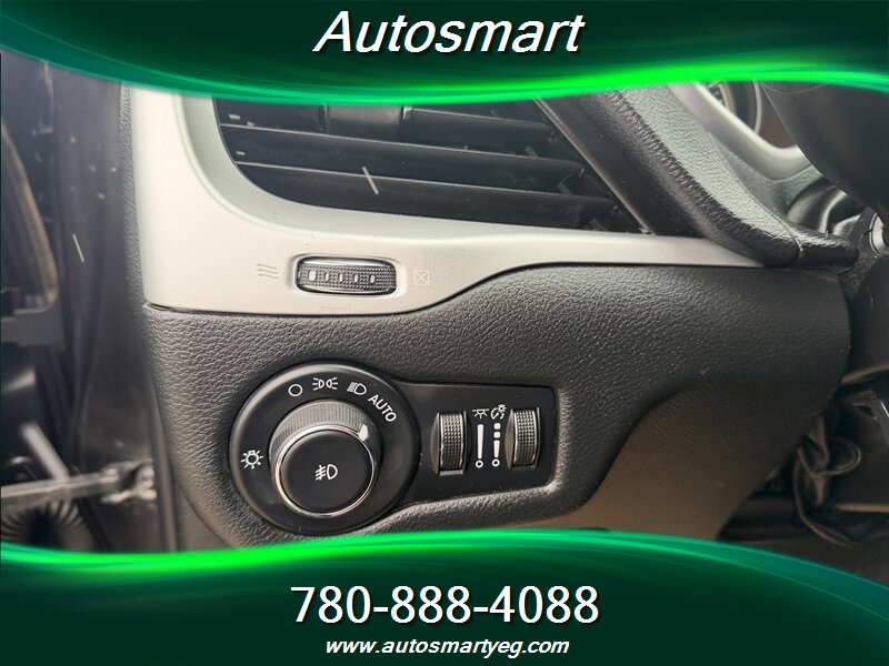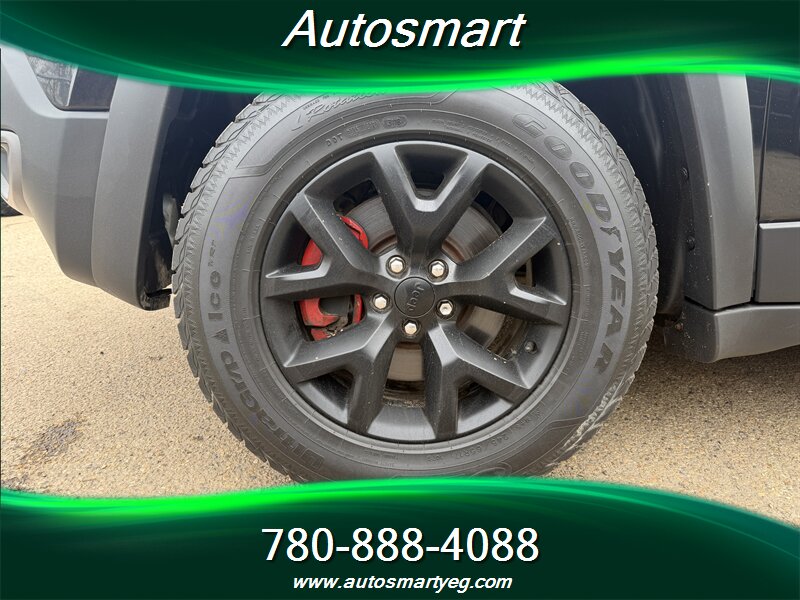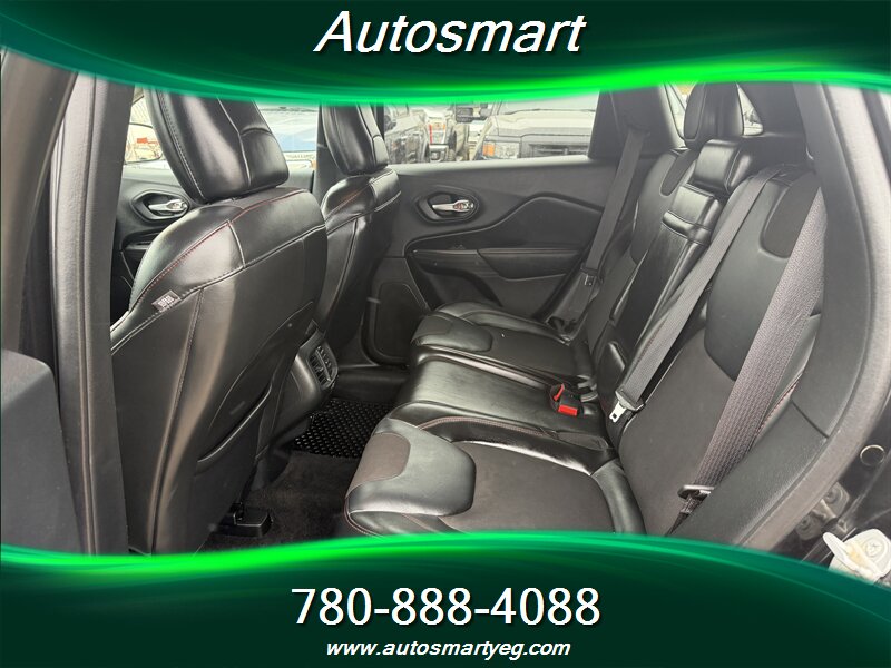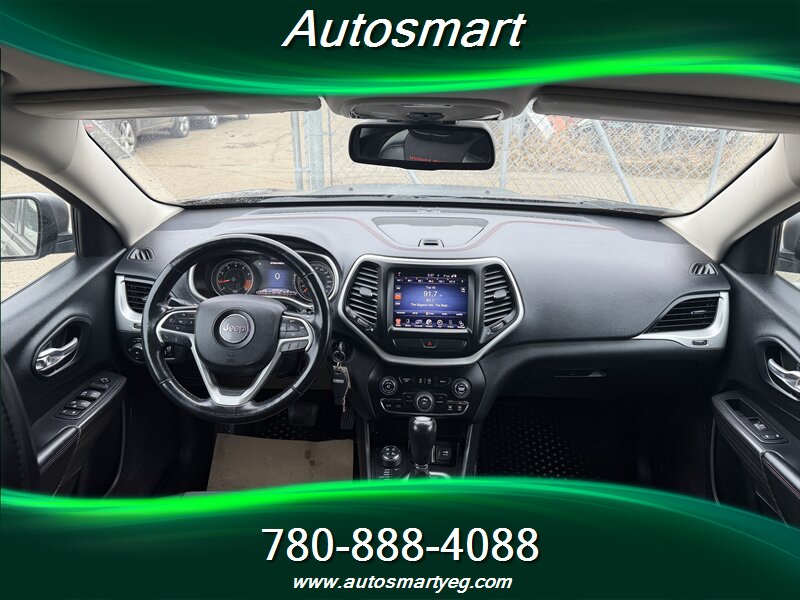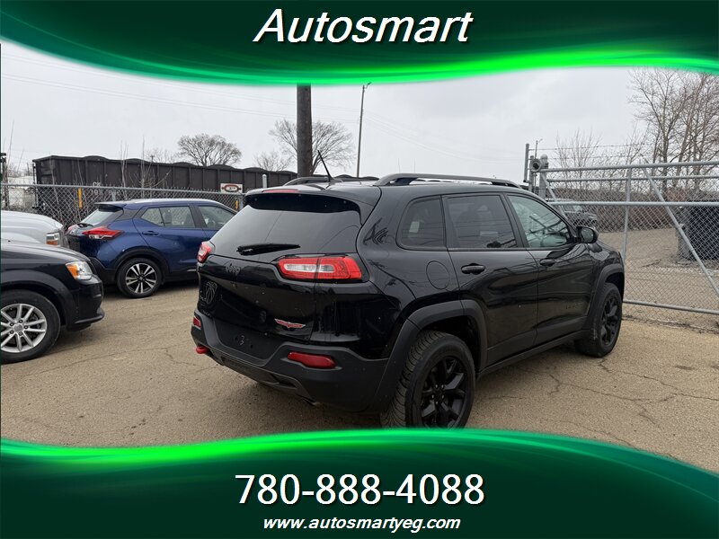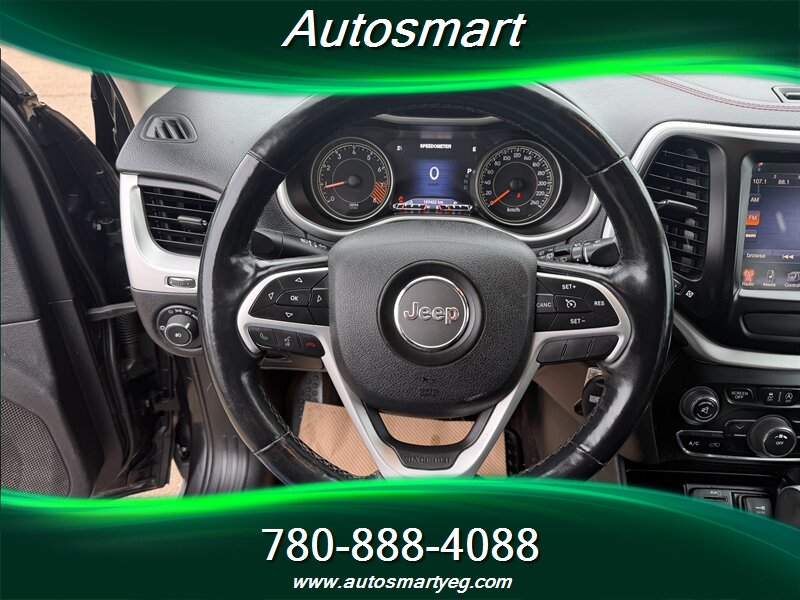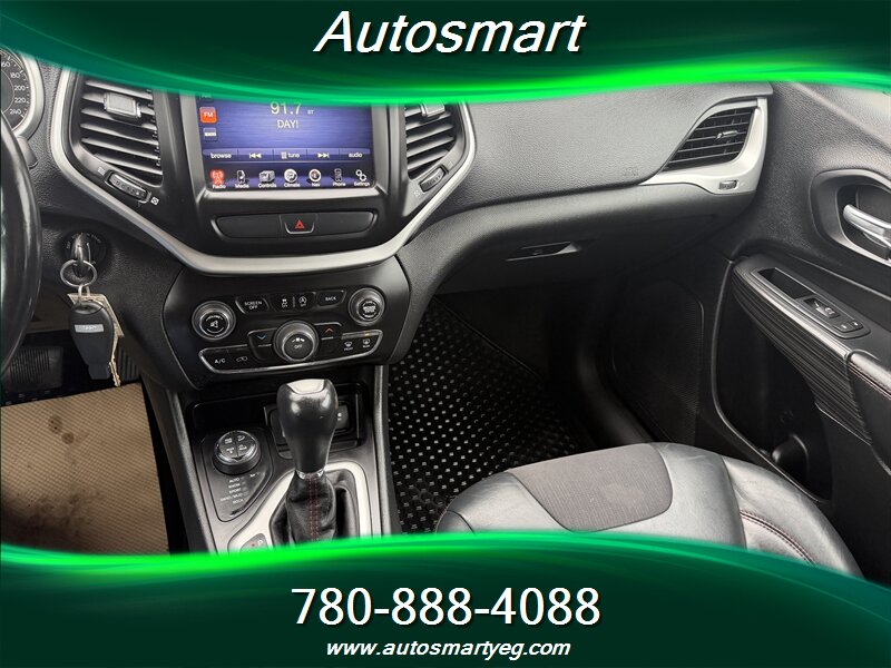 2015 Jeep Cherokee Trailhawk with the 3.2L V6 (271 hp, 239 lb-ft). Factory-standard Trailhawk equipment includes Jeep Active Drive 4x4 with locking rear differential, Selec-Terrain drive modes and hill descent control, raised suspension with protective skid plates and front tow hooks for off-road capability, and the 9-speed automatic transmission. Convenience and safety features include Uconnect infotainment with Bluetooth and steering-wheel audio controls, rearview camera, power windows and locks, dual-zone automatic climate control, cruise control, and a full suite of airbags, ABS, traction and stability control. Fuel consumption is 12.4 L/100 km city and 9.0 L/100 km highway; the vehicle is in excellent overall condition with a CARFAX.