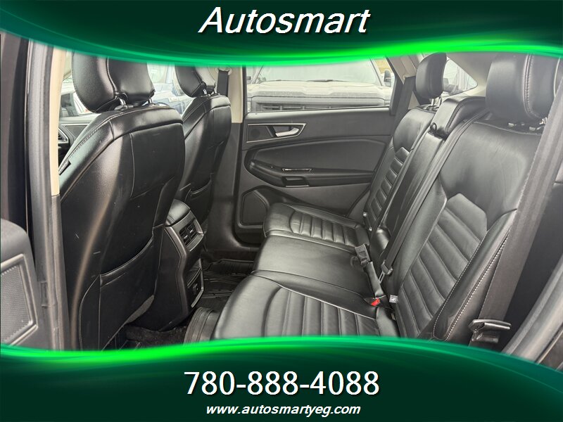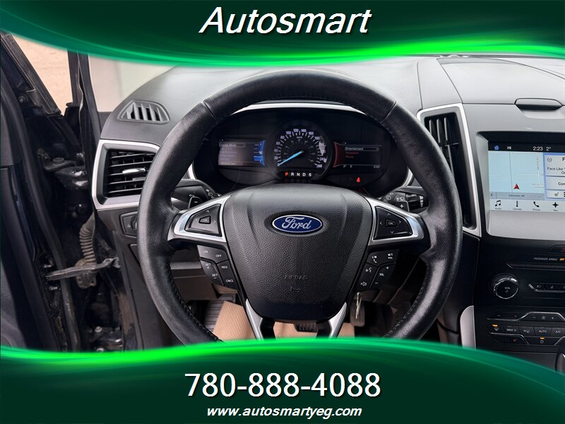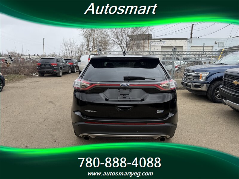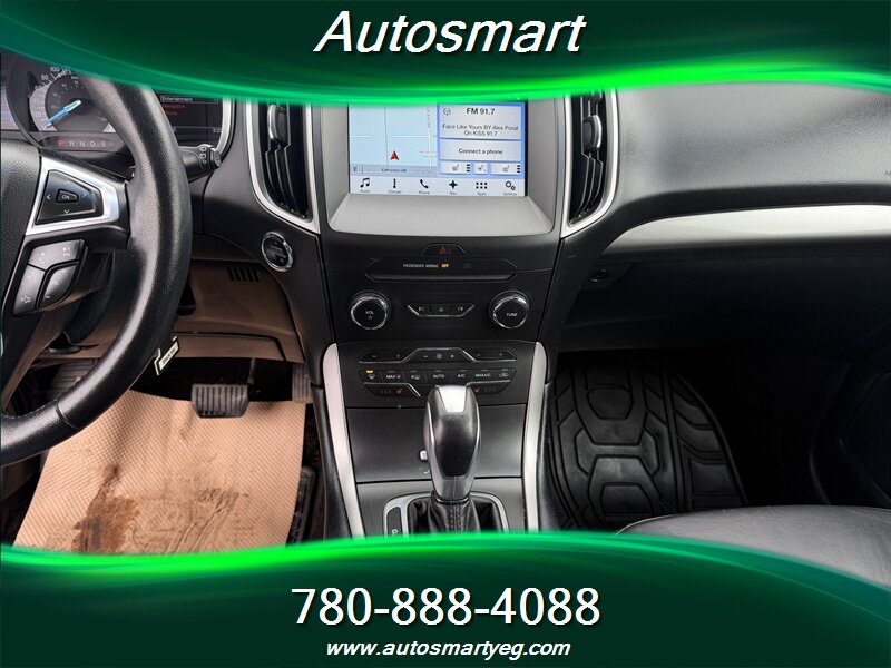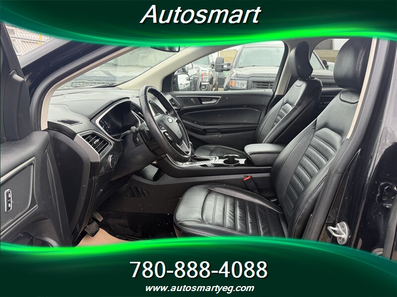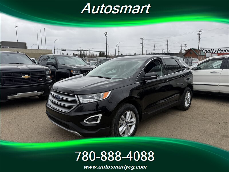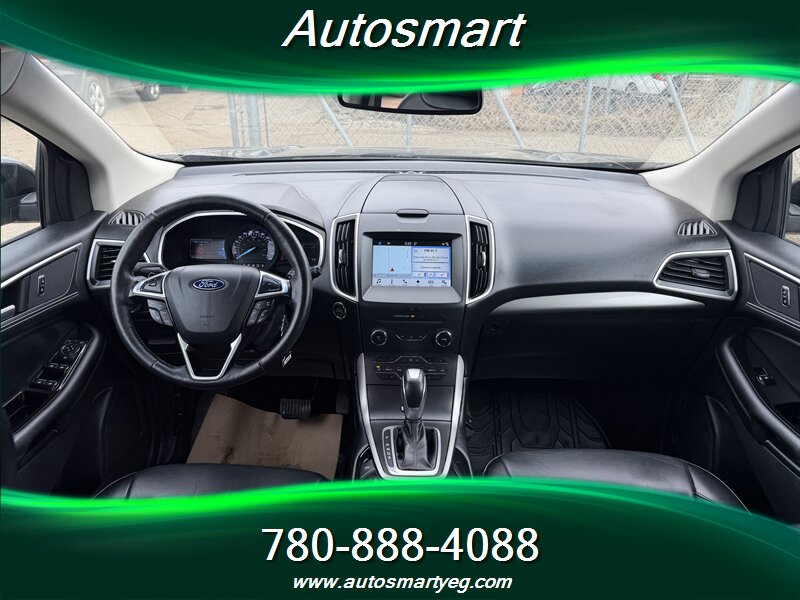 2016 Ford Edge SEL with a 2.0L EcoBoost turbocharged I4 producing 245 hp and 275 ft-lb of torque, paired with a six-speed automatic; fuel economy is 11.8 L/100 km city and 8.4 L/100 km highway. Factory equipment on the SEL includes power-adjustable front seats, 60/40 split-folding rear seat, dual-zone automatic climate control, Ford SYNC with Bluetooth hands-free calling and audio streaming plus steering-wheel audio controls, cruise control, power windows and locks, remote keyless entry, alloy wheels and daytime running lights, ABS with traction and stability control, multiple airbags and a rearview camera. Vehicle is in excellent overall condition and has a CARFAX.