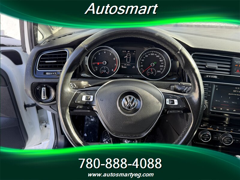 2016 Volkswagen Golf TSI SE powered by a 1.8L turbocharged four-cylinder TSI engine. Factory-standard equipment includes alloy wheels, automatic climate control, heated front seats, power windows and locks, remote keyless entry, multifunction steering wheel with cruise control, touchscreen infotainment with Bluetooth, USB and auxiliary inputs, 60/40 split-folding rear seats, ABS with electronic stability and traction control, multiple airbags and tire pressure monitoring. Fuel consumption: 9.4 L/100 km city and 6.5 L/100 km highway. Vehicle is in excellent overall condition with a CARFAX.