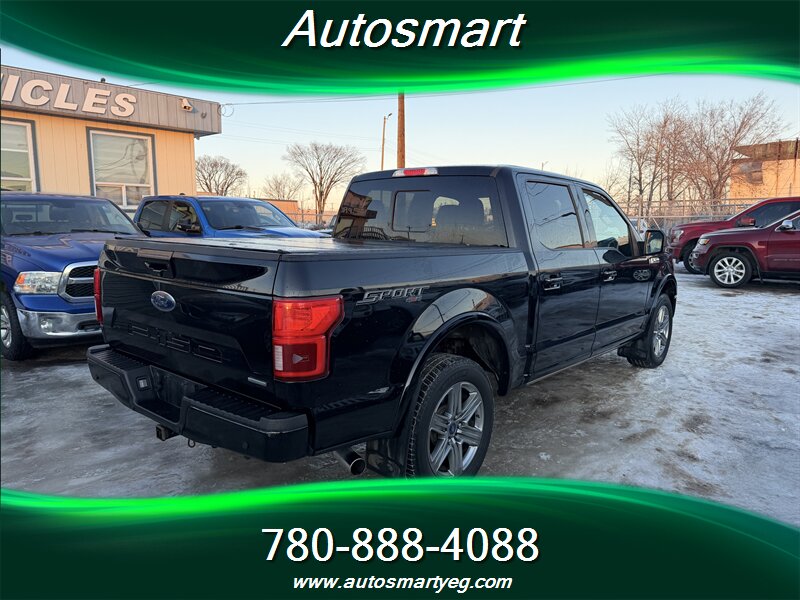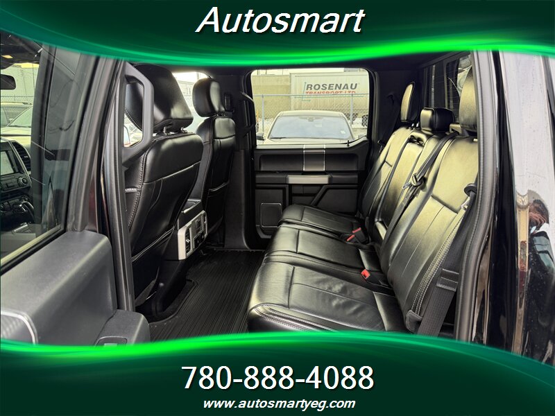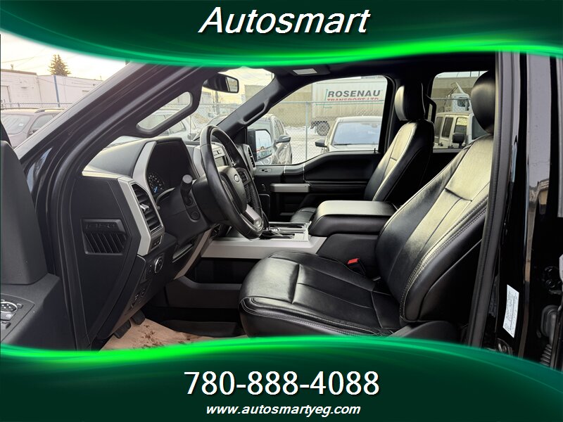 2018 Ford F-150 Lariat with EcoBoost 3.5L twin-turbo V6 (375 hp, 470 lb-ft), exterior Black and interior Black. Factory-equipped with leather-trimmed seating and power-adjustable front seats with driver memory, dual-zone automatic climate control, SYNC 3 infotainment with touchscreen and smartphone integration (Apple CarPlay/Android Auto), keyless entry with push-button start and remote start, power windows/locks/mirrors, alloy wheels. Standard safety and convenience features include a rearview camera, ABS, traction and stability control, and multiple airbags. Fuel economy: 13.8 L/100 km city, 10.2 L/100 km highway. Vehicle is in excellent overall condition with a CARFAX.