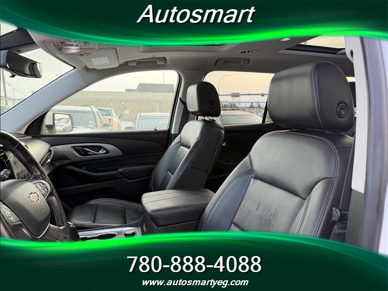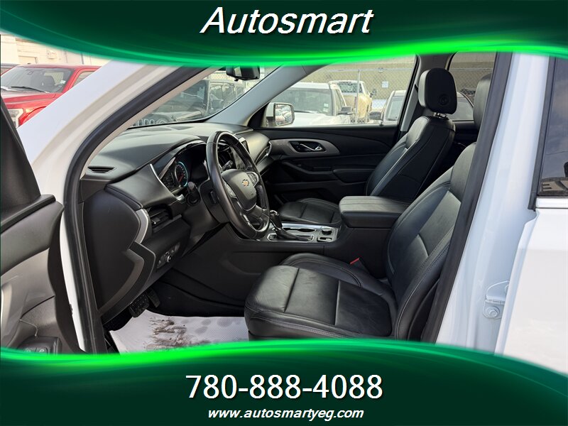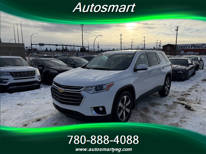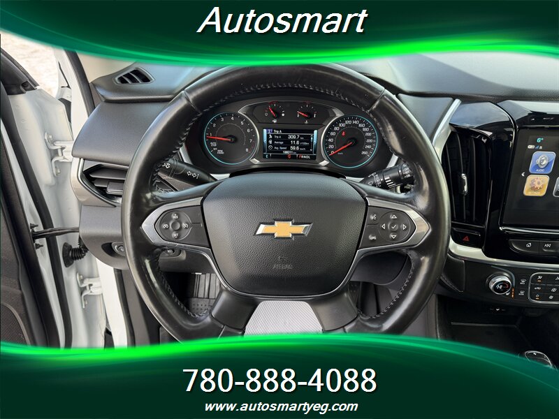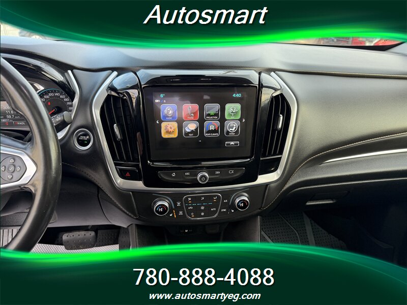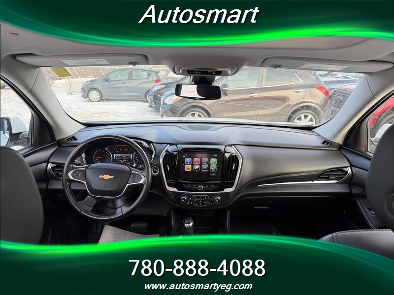 2019 Chevrolet Traverse LT Leather powered by a 3.6L V6 producing 310 hp and 266 ft. lbs.; fuel consumption is 13.8 L/100 km city and 9.4 L/100 km highway. Factory equipment typically includes leather-appointed seating (commonly a 7-passenger layout with second-row captain’s chairs), power-adjustable driver seat, heated front seats, tri-zone automatic climate control, an 8-inch Chevrolet Infotainment touchscreen with Apple CarPlay/Android Auto and Bluetooth, multiple USB ports, rear vision camera, remote keyless entry, alloy wheels and roof rails; standard safety and chassis items include ABS, traction control, StabiliTrak electronic stability control, a full complement of airbags and tire pressure monitoring. Vehicle is in excellent overall condition and has a CARFAX.