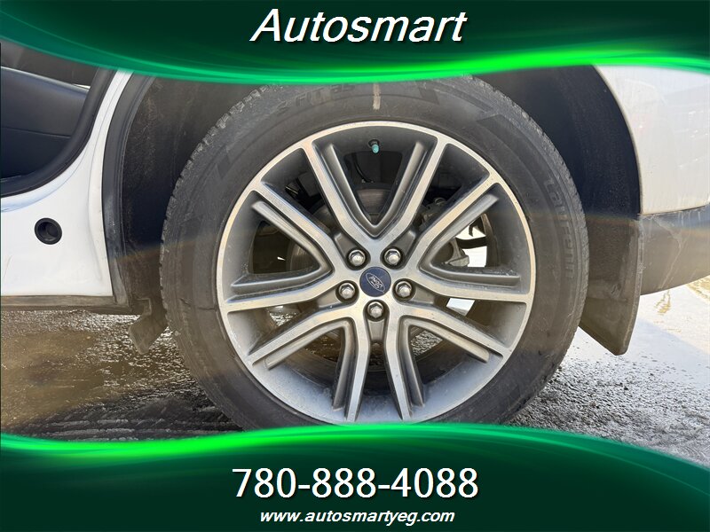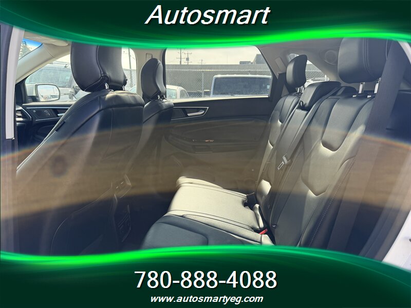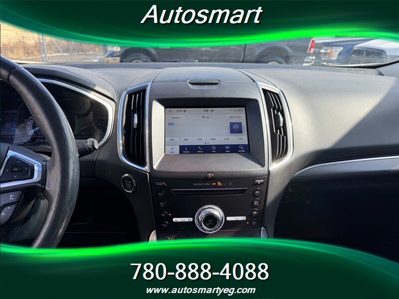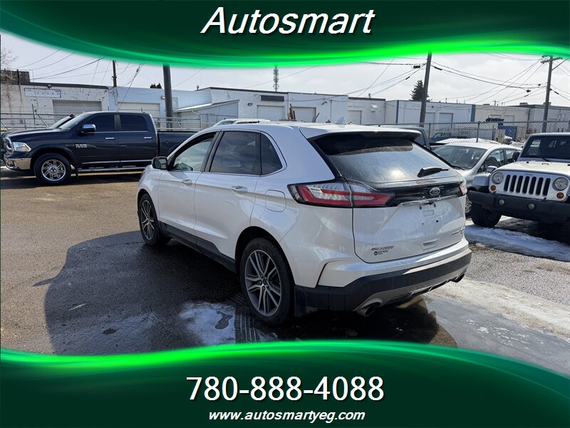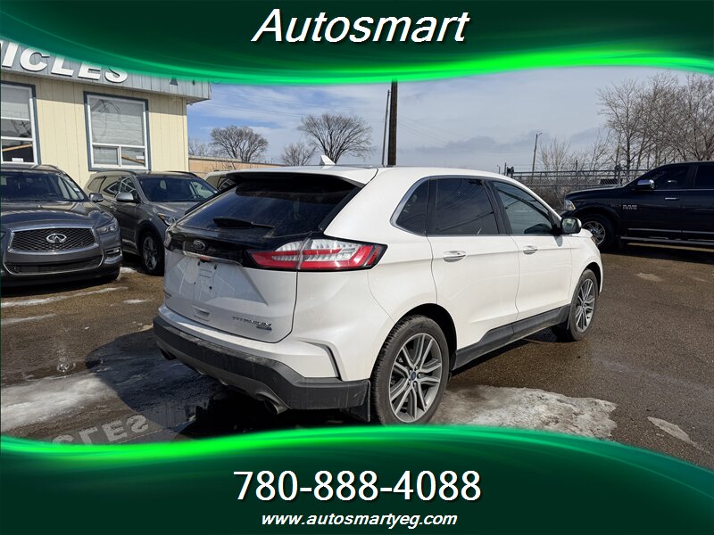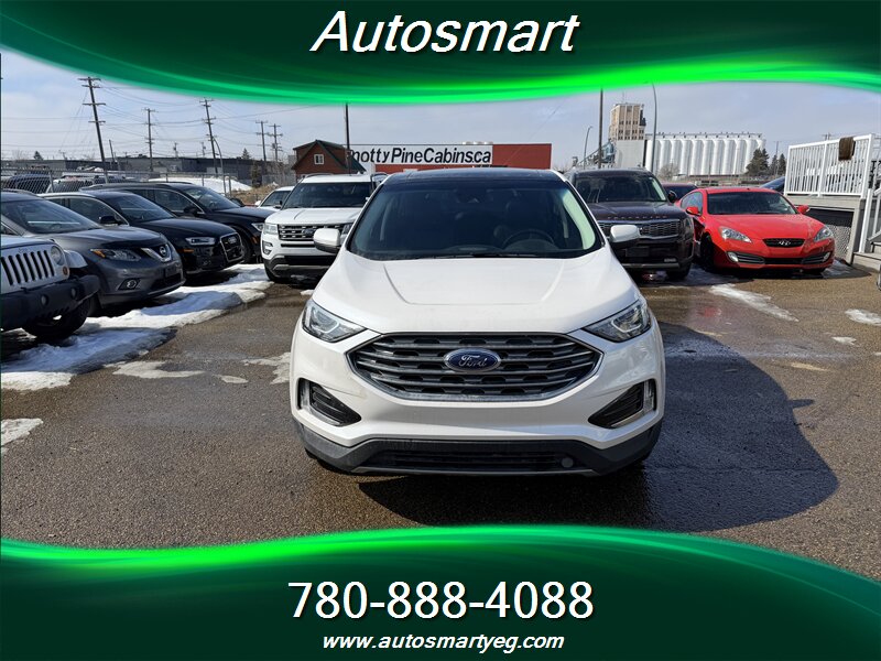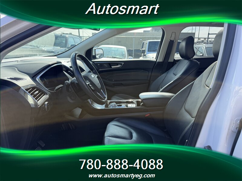 2019 Ford Edge Titanium — EcoBoost 2.0L Turbo I4, 250 hp and 280 lb-ft of torque, in excellent overall condition. Factory-equipped features typically include leather-trimmed seats with heated and ventilated front seats, 10-way power driver’s seat with memory, dual-zone automatic climate control, keyless entry with push-button start and remote start, hands-free power liftgate, blind-spot monitoring with rear cross-traffic alert, rearview camera and parking sensors. Infotainment is handled by SYNC 3 with an 8-inch touchscreen, Apple CarPlay/Android Auto, Bluetooth and available satellite radio; exterior and convenience features include alloy wheels, LED running lights and automatic headlights. Fuel economy is 11.2 L/100 km city and 8.4 L/100 km highway; vehicle has a clean CARFAX.