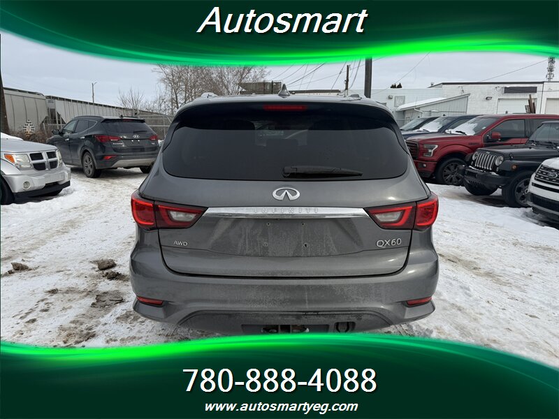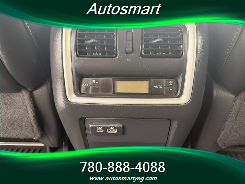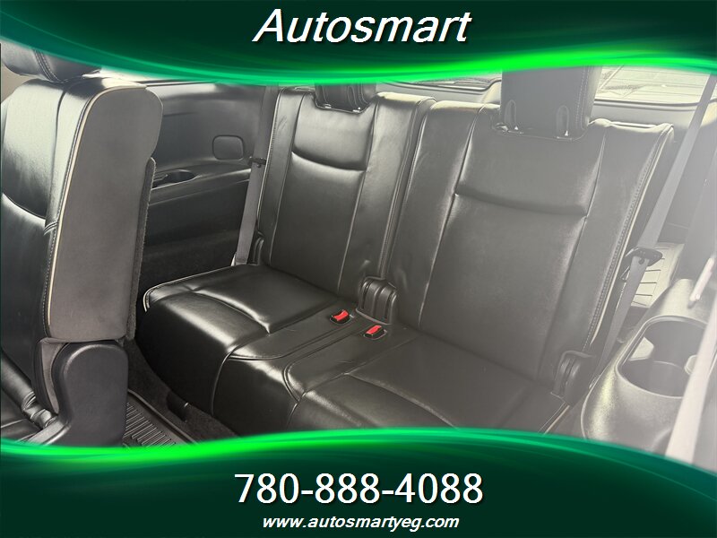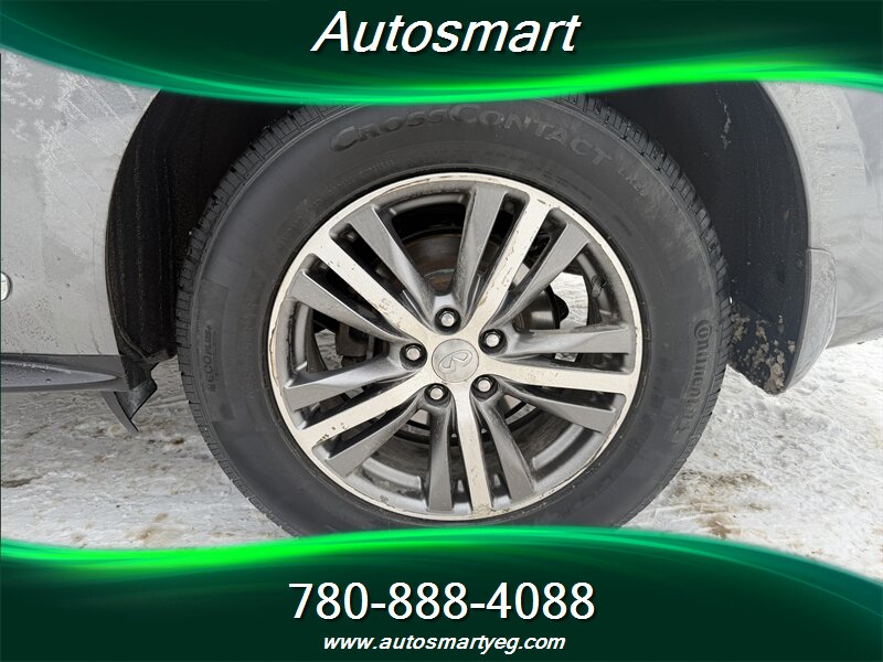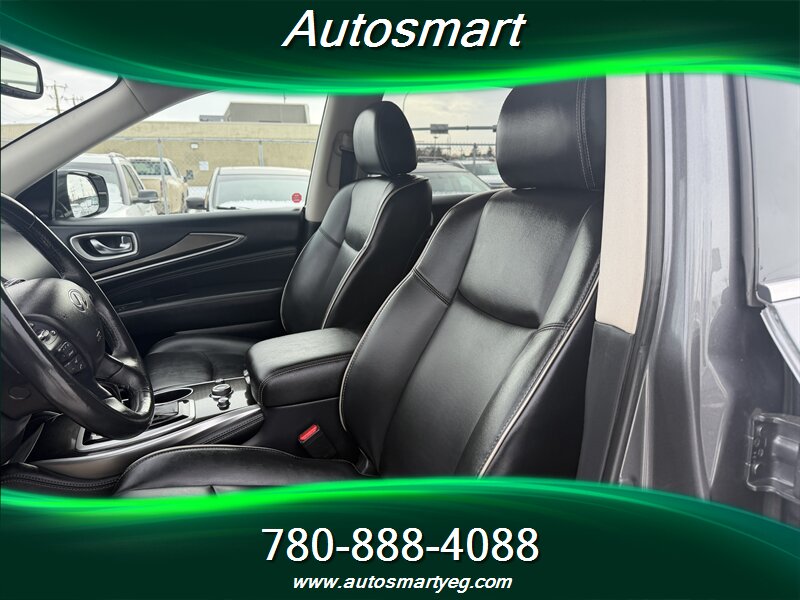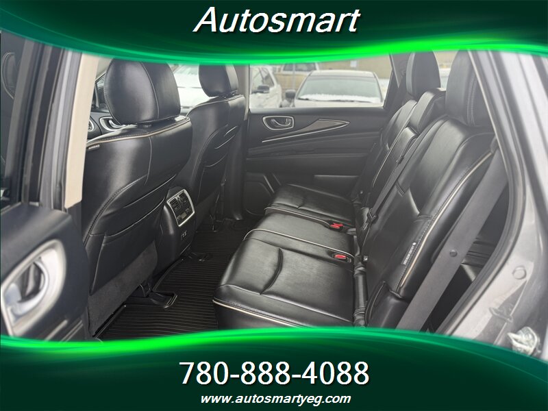 2019 INFINITI QX60 Pure — powered by a 3.5L V6 producing 295 hp and 270 lb-ft, paired with a CVT (front-wheel drive standard, AWD available). Factory equipment includes three-row seating for seven with folding third row, power windows/locks, keyless entry and push-button start, power-adjustable driver’s seat, tri-zone automatic climate control and a hands-free power liftgate. Infotainment features include INFINITI’s system with touchscreen(s), Bluetooth hands-free/streaming, USB ports and a rearview camera; convenience and safety basics are covered by ABS, electronic stability and traction control, and a full complement of airbags. Fuel economy is 12.4 L/100 km city and 9.0 L/100 km highway. Vehicle is in excellent overall condition with a CARFAX.
