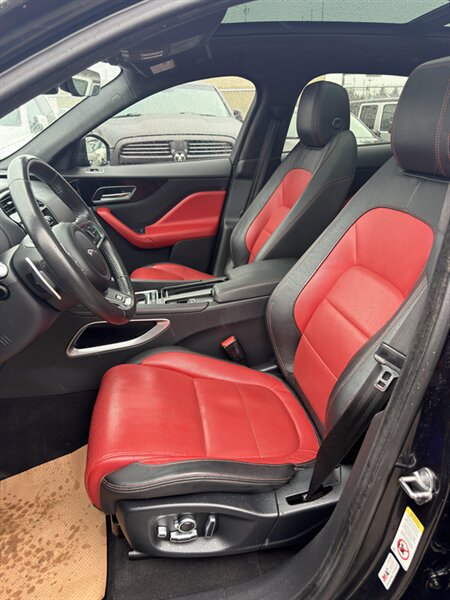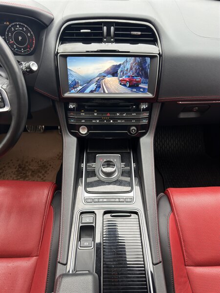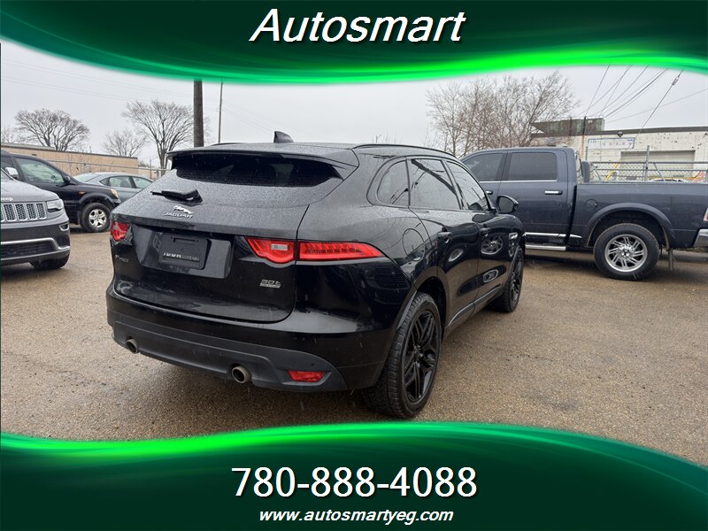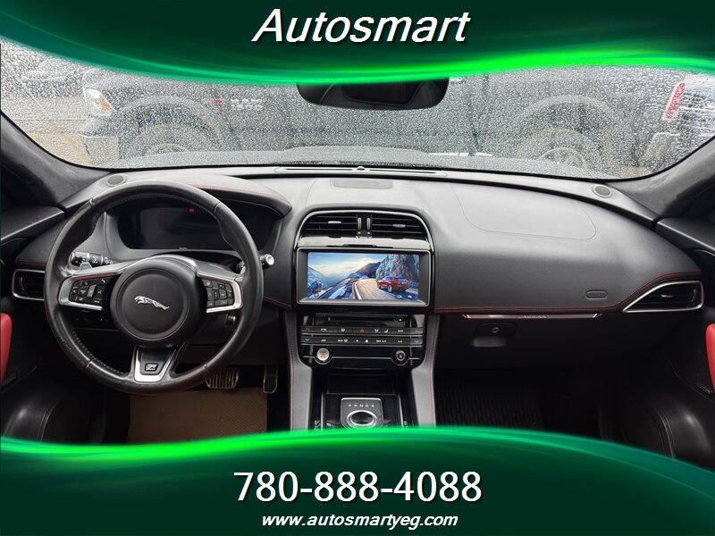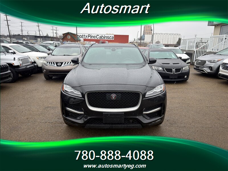 2019 Jaguar F-PACE 30T R-Sport — Powered by a Jaguar Ingenium 2.0L Turbo I4 producing 296 hp and 295 ft-lb of torque, paired with an 8-speed automatic transmission and all-wheel drive. Factory equipment includes R-Sport exterior styling, alloy wheels, automatic LED headlights, front and rear parking sensors with rearview camera, dual-zone automatic climate control, leather seating surfaces with power-adjustable front seats and heated front seats, leather-wrapped steering wheel with paddle shifters and steering-wheel controls, Jaguar InControl infotainment with navigation and Bluetooth connectivity, keyless entry with push-button start, multiple airbags, ABS, and stability/traction control. Rated at 10.7 L/100 km city and 8.7 L/100 km highway, this vehicle is in excellent overall condition and has a CARFAX.