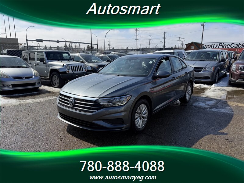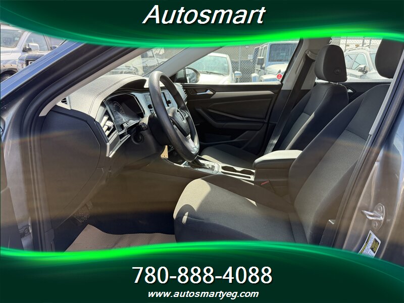 2019 Volkswagen Jetta Comfortline — Gray exterior, Black interior, excellent overall condition with a CARFAX. Factory equipment includes a turbocharged 4-cylinder engine paired with an automatic transmission, power windows/locks/mirrors, remote keyless entry and cruise control; comfortable cloth seating with adjustable front seats and a 60/40 split-folding rear bench; a touchscreen infotainment system with Bluetooth, USB input, smartphone integration (Apple CarPlay/Android Auto) and steering-wheel audio/phone controls; rearview camera; alloy wheels with daytime running lights; and standard safety systems such as ABS, stability and traction control, multiple airbags, tire pressure monitoring and ISOFIX/LATCH child seat anchors.