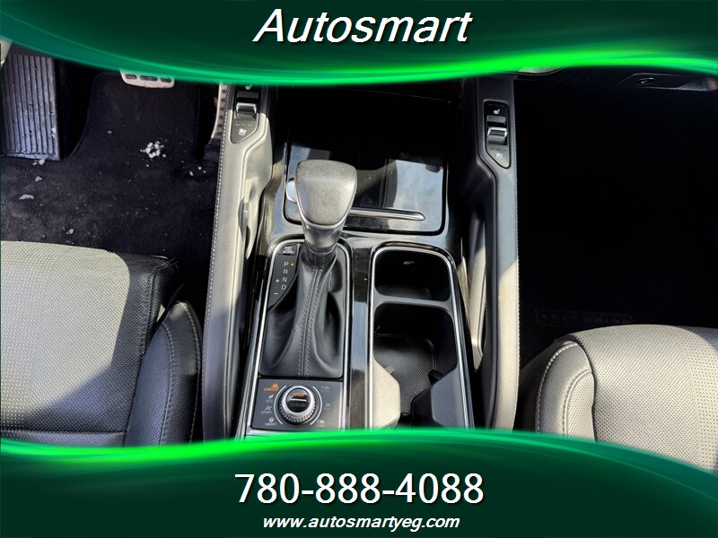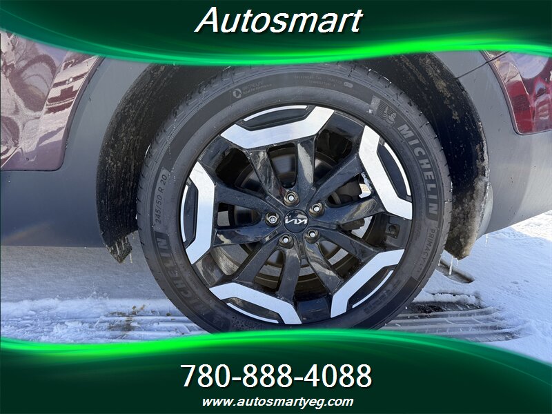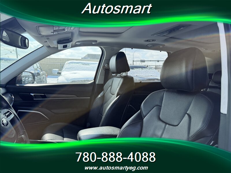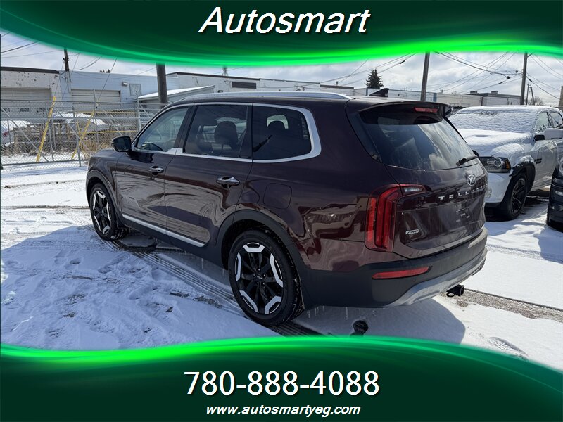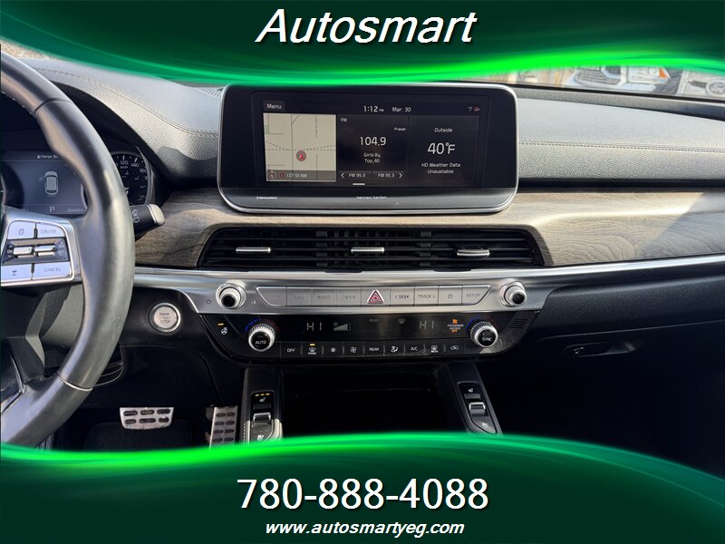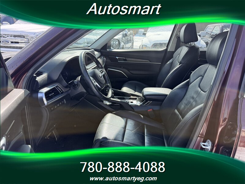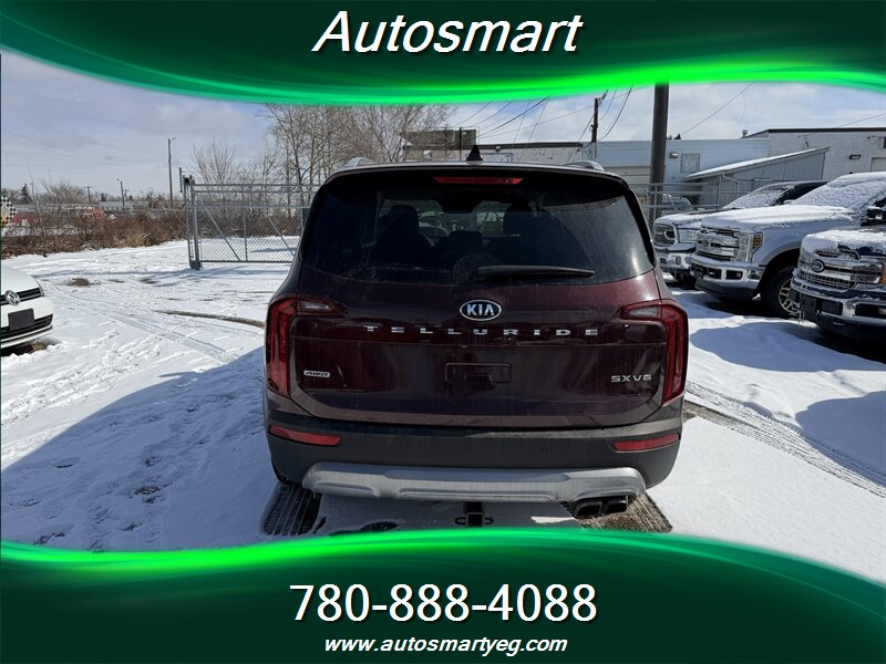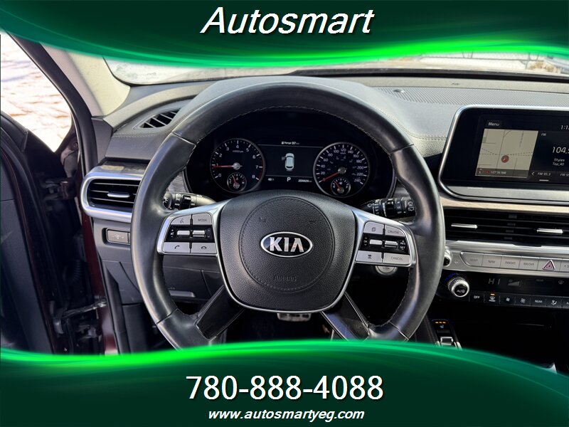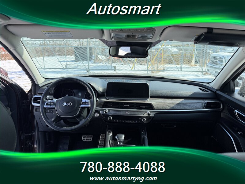 2020 Kia Telluride SX — powered by a 3.8L V6 producing 291 hp and 262 lb-ft of torque. Fuel consumption: 12.4 L/100 km city and 9.8 L/100 km highway. Factory-standard equipment on the SX includes leather-trimmed seating, heated and ventilated front seats and heated second-row seats, power-adjustable driver seat with memory, tri-zone automatic climate control and a panoramic sunroof; exterior and convenience features such as 20-inch alloy wheels, LED headlights and taillights, roof rails, hands-free power liftgate, keyless entry with push-button start and remote start; advanced safety and driver-assist systems including forward collision avoidance, blind-spot monitoring with rear cross-traffic alert, lane-keeping assist, adaptive cruise control and parking sensors; and a modern infotainment suite with a large touchscreen, Apple CarPlay/Android Auto, Bluetooth, multiple USB ports, wireless phone charging and a premium audio system. Vehicle is in excellent overall condition and has a CARFAX report.