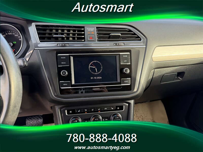 2020 Volkswagen Tiguan SE 4MOTION with a 2.0L turbo I4 (184 hp, 221 lb-ft) and an 8-speed automatic delivers confident all-wheel-drive performance. Factory equipment includes 4MOTION AWD, 8-inch touchscreen infotainment with Apple CarPlay/Android Auto and Bluetooth, multiple USB ports, dual-zone automatic climate control, heated front seats, power-adjustable driver’s seat, keyless access with push-button start, roof rails and 18-inch alloy wheels, plus LED daytime running lights. Standard safety systems include forward collision warning with automatic emergency braking, blind-spot monitoring and rear traffic alert, along with a rearview camera. Exterior is Pure White with a Titan Black interior; fuel economy is 11.8 L/100 km city and 8.7 L/100 km highway. Vehicle is in excellent overall condition with a CARFAX.